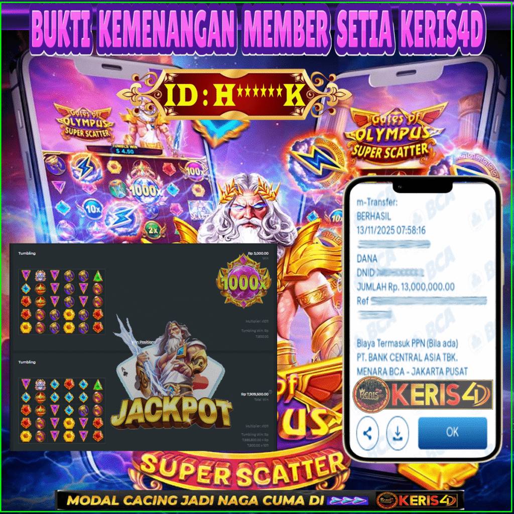 Setiap hari, member KERIS4D berhasil meraih jackpot besar dari berbagai provider slot ternama yang kami sediakan, seperti Pragmatic Play, Habanero, PG Soft, dan masih banyak lagi. Kami secara rutin menampilkan bukti screenshot atau rekapan kemenangan yang berhasil diraih, mulai dari kemenangan ratusan ribu hingga puluhan juta rupiah. Semua slip kemenangan ini kami hadirkan untuk membuktikan bahwa di KERIS4D, peluang menang itu nyata.