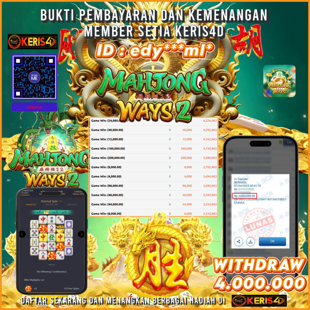 KERIS4D dikenal sebagai situs terpercaya yang selalu menghadirkan pengalaman bermain slot online yang aman, fair, dan berlisensi resmi. Di sini, kami tidak hanya sekadar memberikan janji, tapi bukti nyata berupa slip kemenangan yang dapat Anda lihat secara langsung.