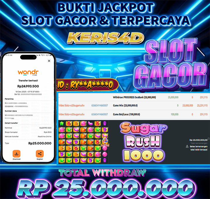 KERIS4D dikenal sebagai situs terpercaya yang selalu menghadirkan pengalaman bermain slot online yang aman, fair, dan berlisensi resmi. Di sini, kami tidak hanya sekadar memberikan janji, tapi bukti nyata berupa slip kemenangan yang dapat Anda lihat secara langsung.