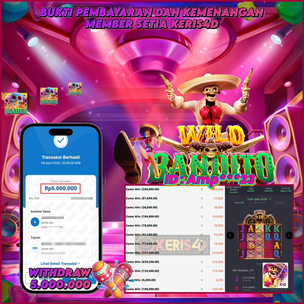 Setiap hari, member KERIS4D berhasil meraih jackpot besar dari berbagai provider slot ternama yang kami sediakan, seperti Pragmatic Play, Habanero, PG Soft, dan masih banyak lagi. Kami secara rutin menampilkan bukti screenshot atau rekapan kemenangan yang berhasil diraih, mulai dari kemenangan ratusan ribu hingga puluhan juta rupiah. Semua slip kemenangan ini kami hadirkan untuk membuktikan bahwa di KERIS4D, peluang menang itu nyata.